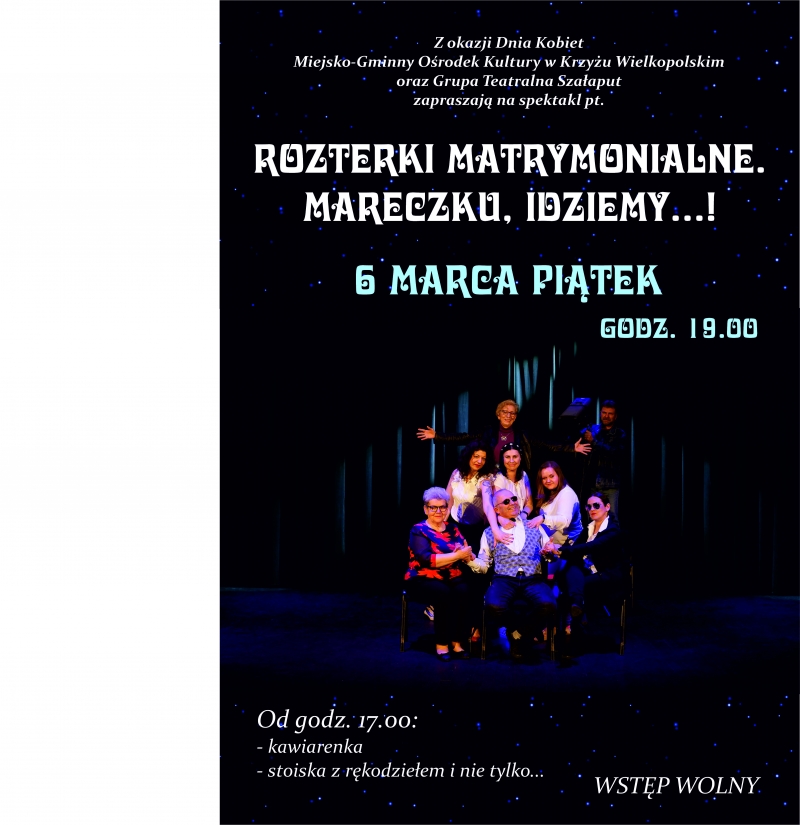Z okazji Dnia Kobiet zapraszamy na niezwykłe wydarzenie. Lubiany spektakl Grupy Teatralnej Szałaput już 6 marca o godz. 19.00. Będzie dużo śmiechu i wspaniała uczta teatralna.