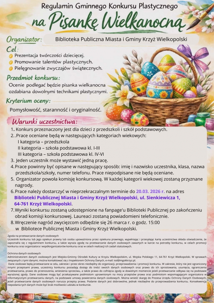 8. Wręczenie nagród zwycięzcom odbędzie się 26 marca 2026 r. o godz. 15:00 w Bibliotece Publicznej Miasta i Gminy Krzyż Wielkopolski.