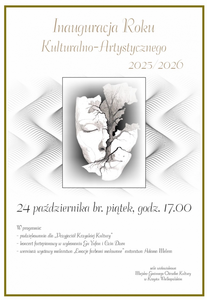 Serdecznie zapraszamy na uroczystą Inaugurację Roku Kulturalno-Artystycznego 2025/2026, która odbędzie się 24 października o godzinie 17:00 w murach naszego Ośrodka Kultury.