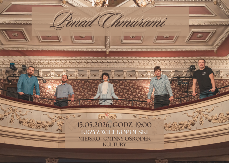 Z ogromną przyjemnością zapraszamy Państwa na wyjątkowy koncert, który już za miesiąc odbędzie się na scenie naszego Ośrodka Kultury. 15 maja odwiedzi nas zespół Ponad Chmurami - grupa, która od blisko 12 lat konsekwentnie buduje swoją pozycję na polskiej scenie muzycznej, tworząc poezję śpiewaną w niezwykle wrażliwym i poruszającym wydaniu.