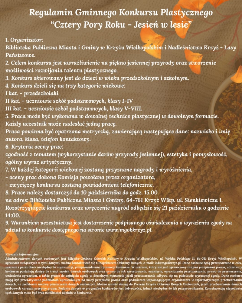 Serdecznie zapraszamy dzieci w wieku przedszkolnym i szkolnym, do udziału w konkursie plastycznym: "Cztery pory roku - Jesień w lesie".