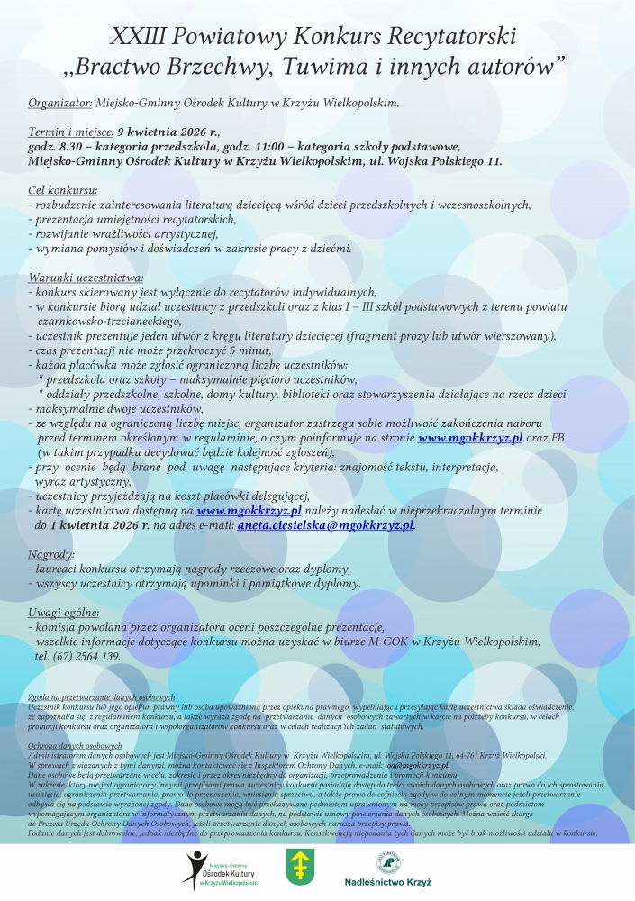 Zapraszamy do udziału w XXIII Powiatowym Konkursie Recytatorskim „Bractwo Brzechwy, Tuwima i innych autorów” - wydarzeniu, które od ponad dwóch dekad odkrywa młode talenty i pozwala dzieciom z dumą prezentować swoje umiejętności na scenie. Konkurs skierowany jest wyłącznie do recytatorów indywidualnych: dzieci z przedszkoli oraz klas I-III szkół podstawowych. To wyjątkowa okazja, by zaprezentować swoją interpretację ulubionych wierszy, rozwinąć pewność siebie i poczuć radość płynącą z obcowania z literaturą.